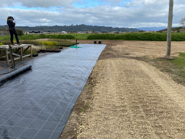Once we got a small area prepared we laid some weedmat and moved the first plants onto the site. This was much needed relief to all the various places around town that we had been storing plants. Finally we could start moving them to just one site.